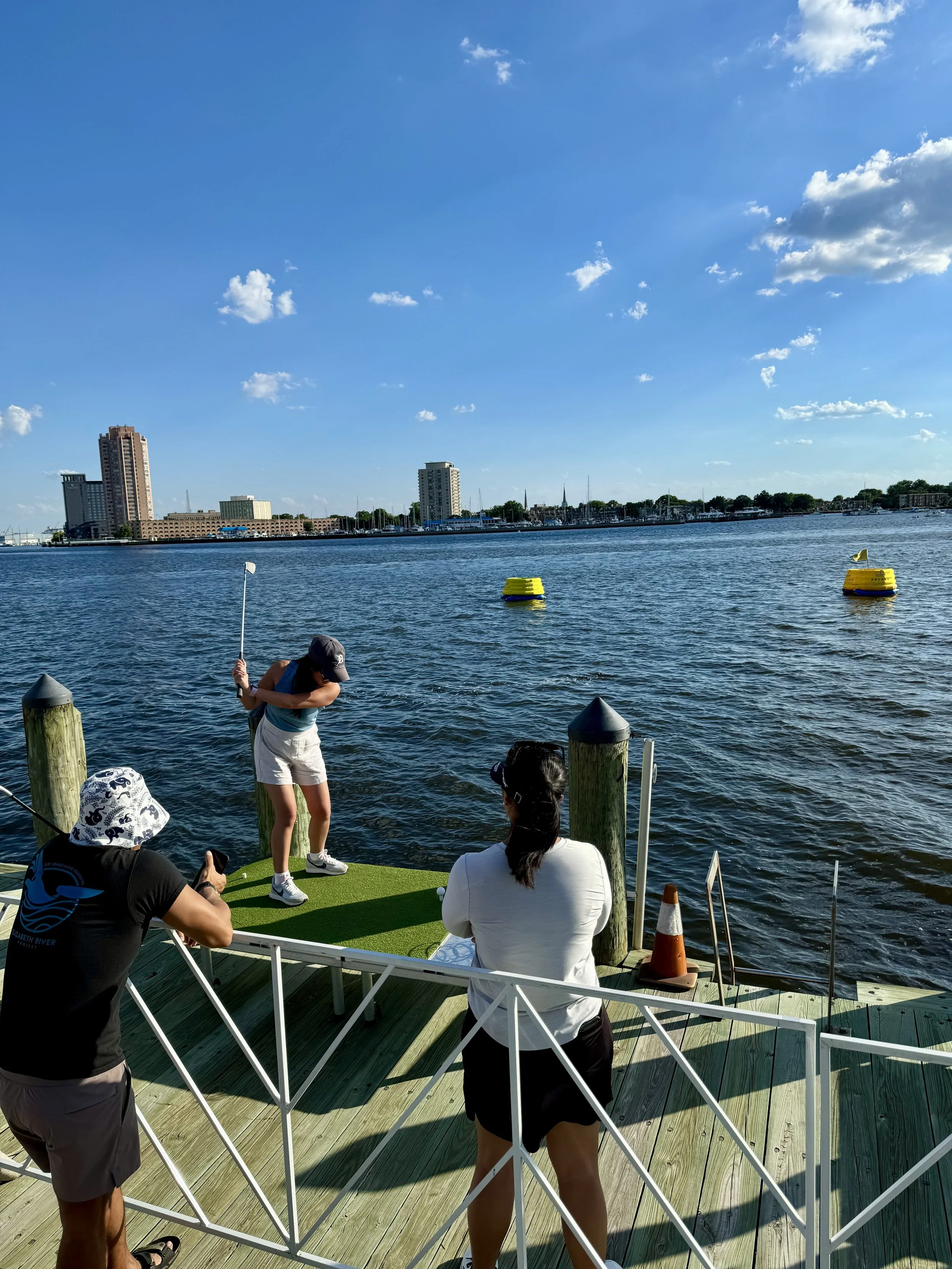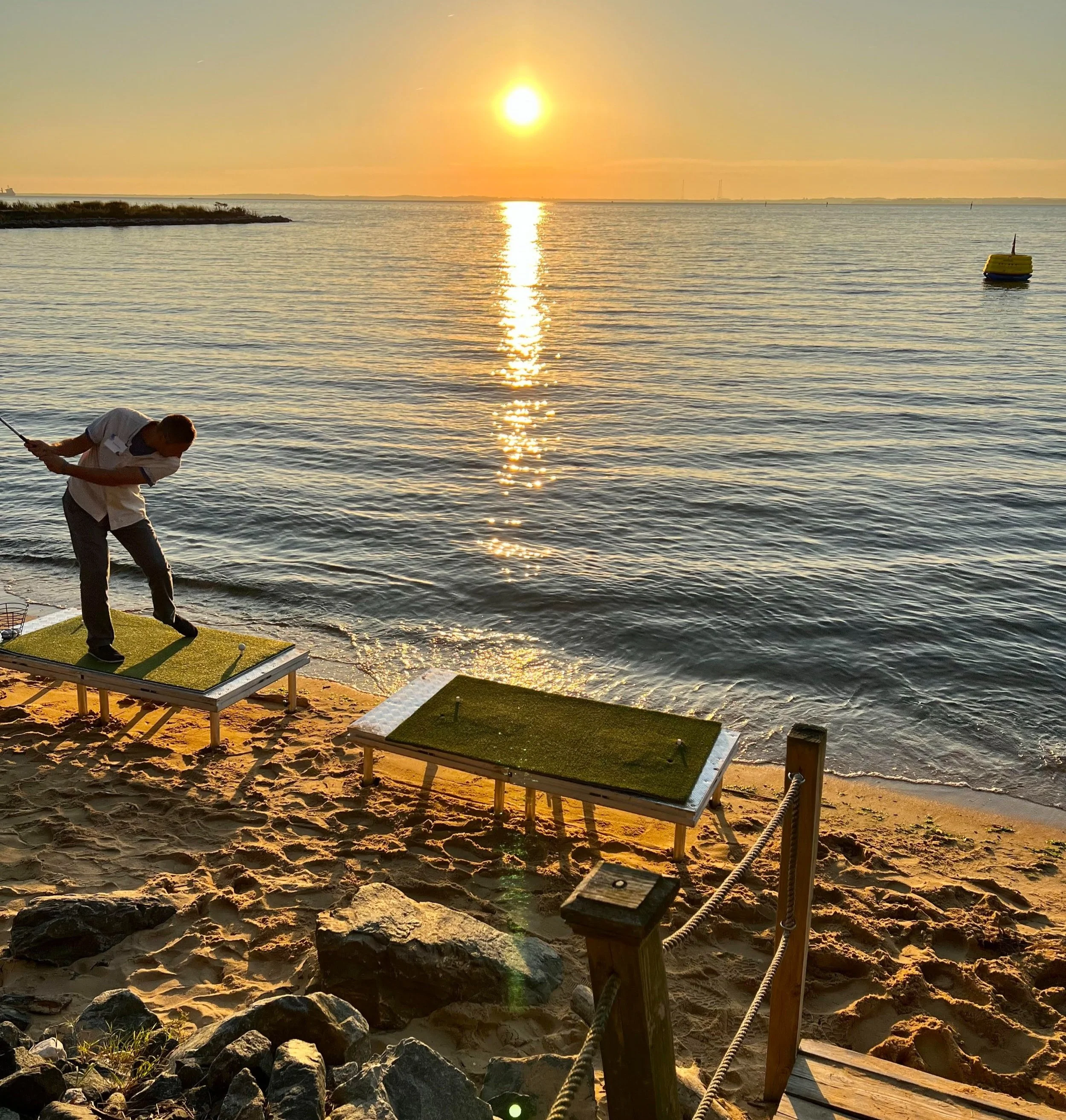 A waterfront driving range is where participants hit biodegradable golf balls into the water at floating golf targets. Waterfront driving ranges can take place on all bodies of water, including oceans, rivers, bays, lakes, and ponds. We’ve produced waterfront driving range events on the Chesapeake Bay, Atlantic Ocean, Potomac River, and several other rivers, bays, lakes, and ponds. For advice on how to build a waterfront driving range, check out our Ultimate Guide To Building A Waterfront Driving Range blog post.